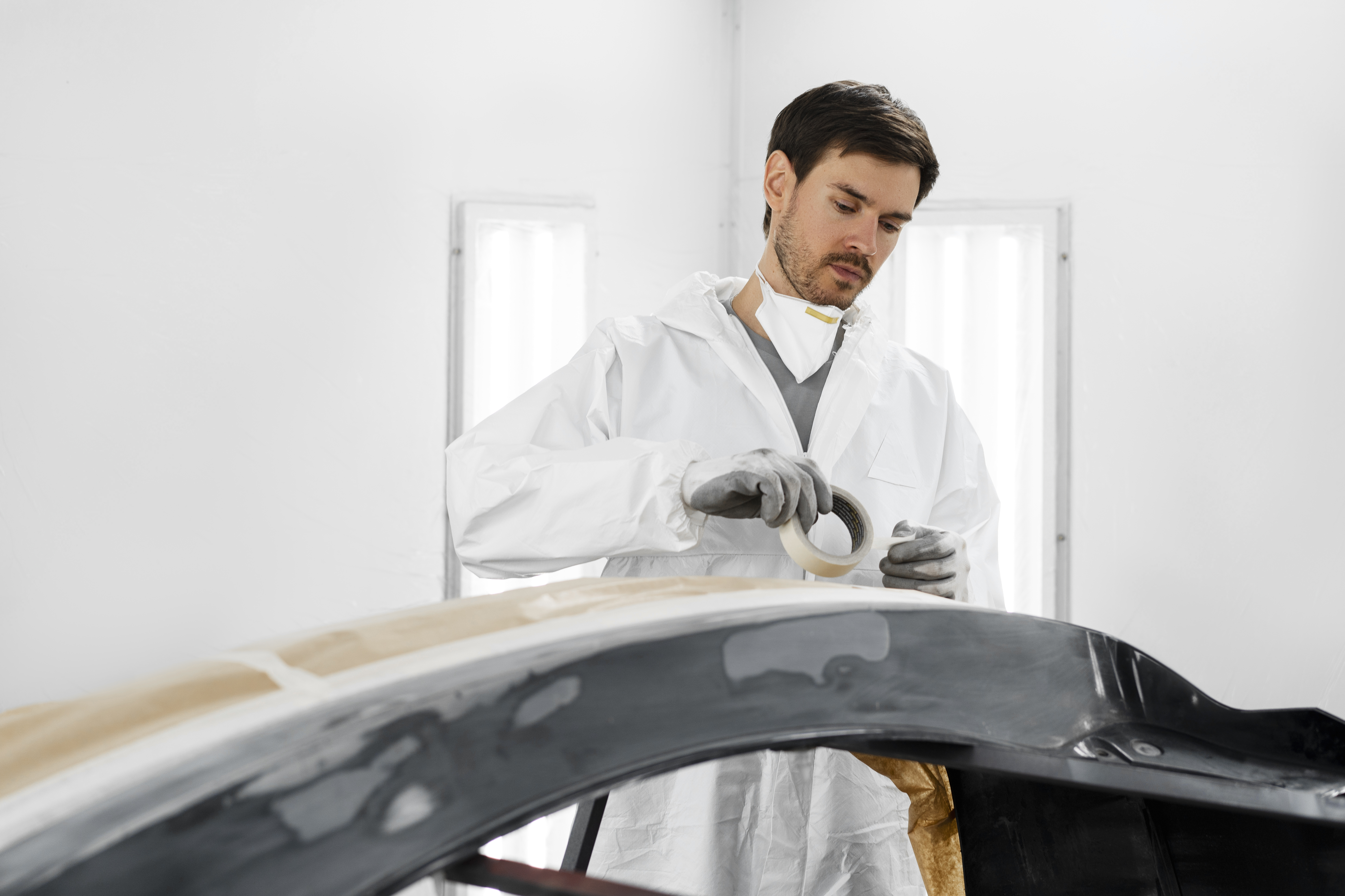 تغطية الأجزاء التي لا يجب أن يصل إليها الطلاء (الزجاج، الكشافات، الإطارات)